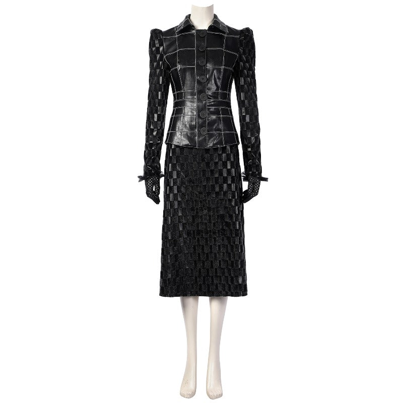 Vestido de Cruella Deville para Halloween con Chaqueta de Cuero Negro y Peluca